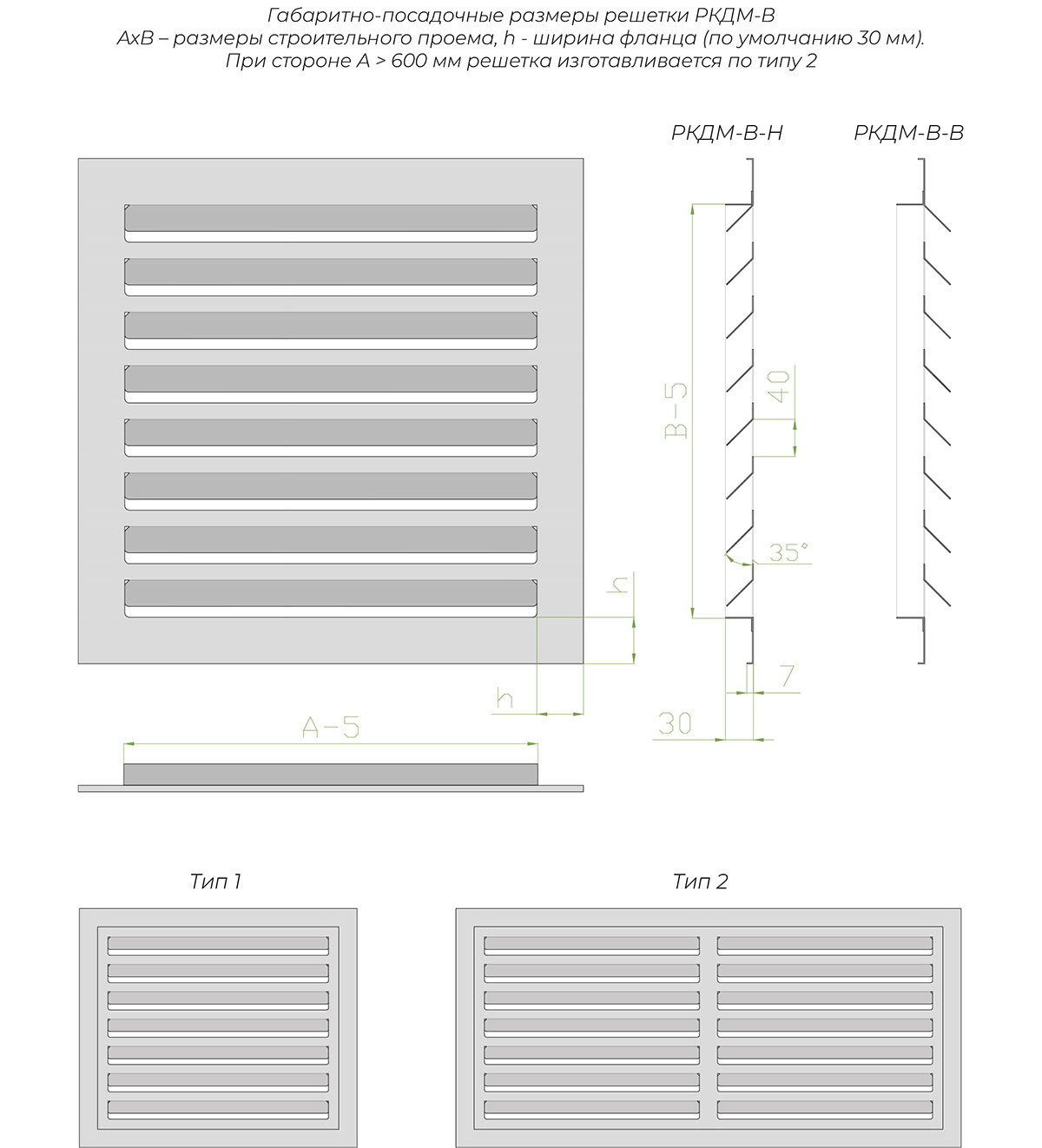 Решетка РКДМ-В представляет собой рамку и полотно из ламелей, отогнутых внутрь на 30 мм. По умолчанию ширина фланца 30 мм, по требованию возможно изготовление решетки с фланцем от 30 до 60 мм. Определяющими размерами (АхВ) являются размеры строительного проема. При заказе нужно указывать именно их, а посадочные размеры решетки будут меньше на несколько миллиметров, чтобы жалюзийное полотно беспрепятственно вошло в строительный проем.