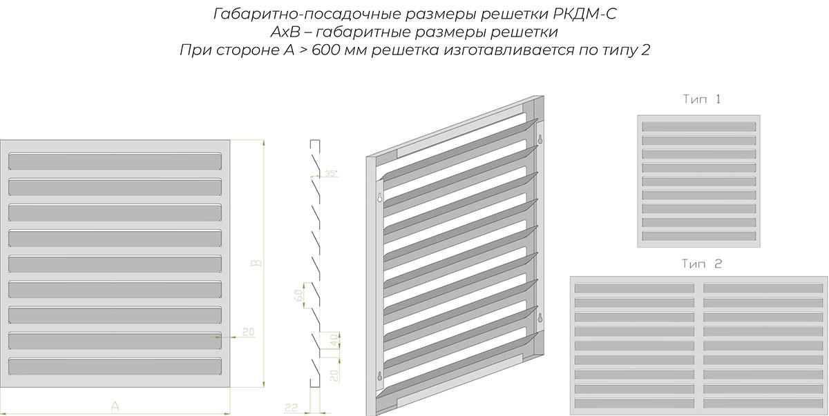 РКДМ-С изготавливается по типу стандартной решетки ВРН-РКДМ, но отличается конструкцией рамки, в которой имеется дополнительный загиб с отверстиями для скрытого крепления к клапану дымоудаления. Определяющими размерами (АхВ) при заказе являются габаритные размеры решетки.