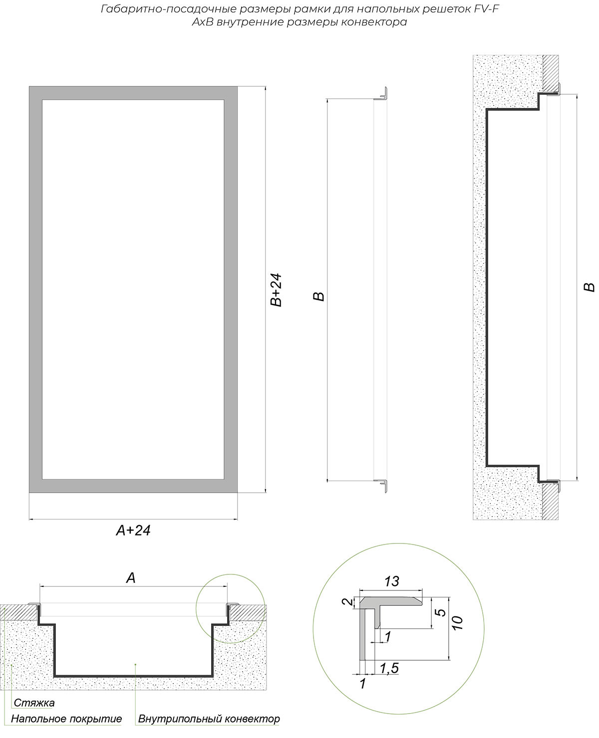Рамки решеток внутрипольного конвектора предназначены для надежного и незаметного закрытия зазоров, образующихся при монтаже по краям конвектора. F-образный профиль позволяет монтировать конвектор в любую конструкцию пола. Скрывает стык между корпусом конвектора и напольным покрытием. Поставляется в цвет решетки.