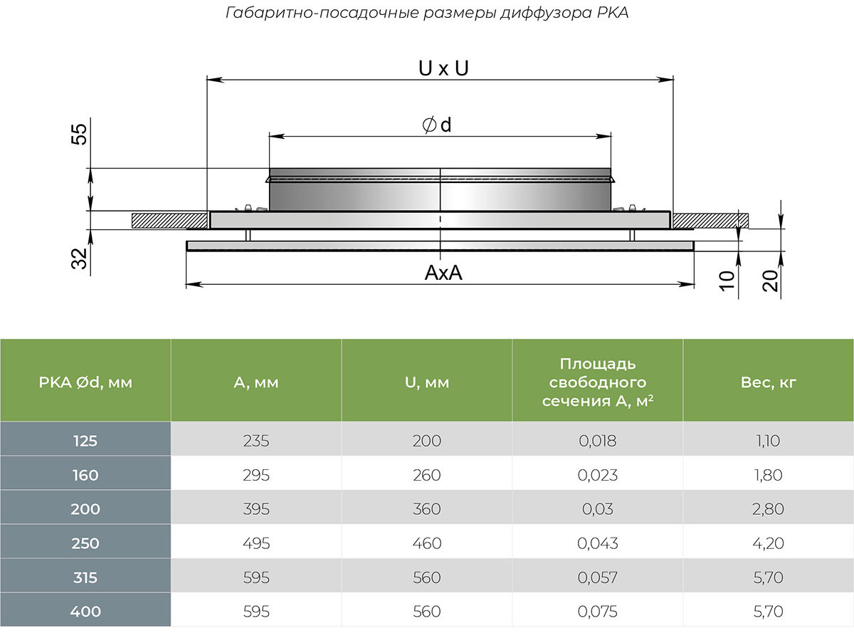 Диффузоры изготавливаются из оцинкованной листовой стали толщиной 0,9 мм и по умолчанию покрываются полимерной порошковой краской белого цвета RAL 9016M (матовая). Камера статического давления по умолчанию поставляется без покрытия. По запросу возможна окраска в любой цвет по международной шкале RAL как лицевой панели, так и камеры. Заказать камеру статического давления для диффузора PKA.