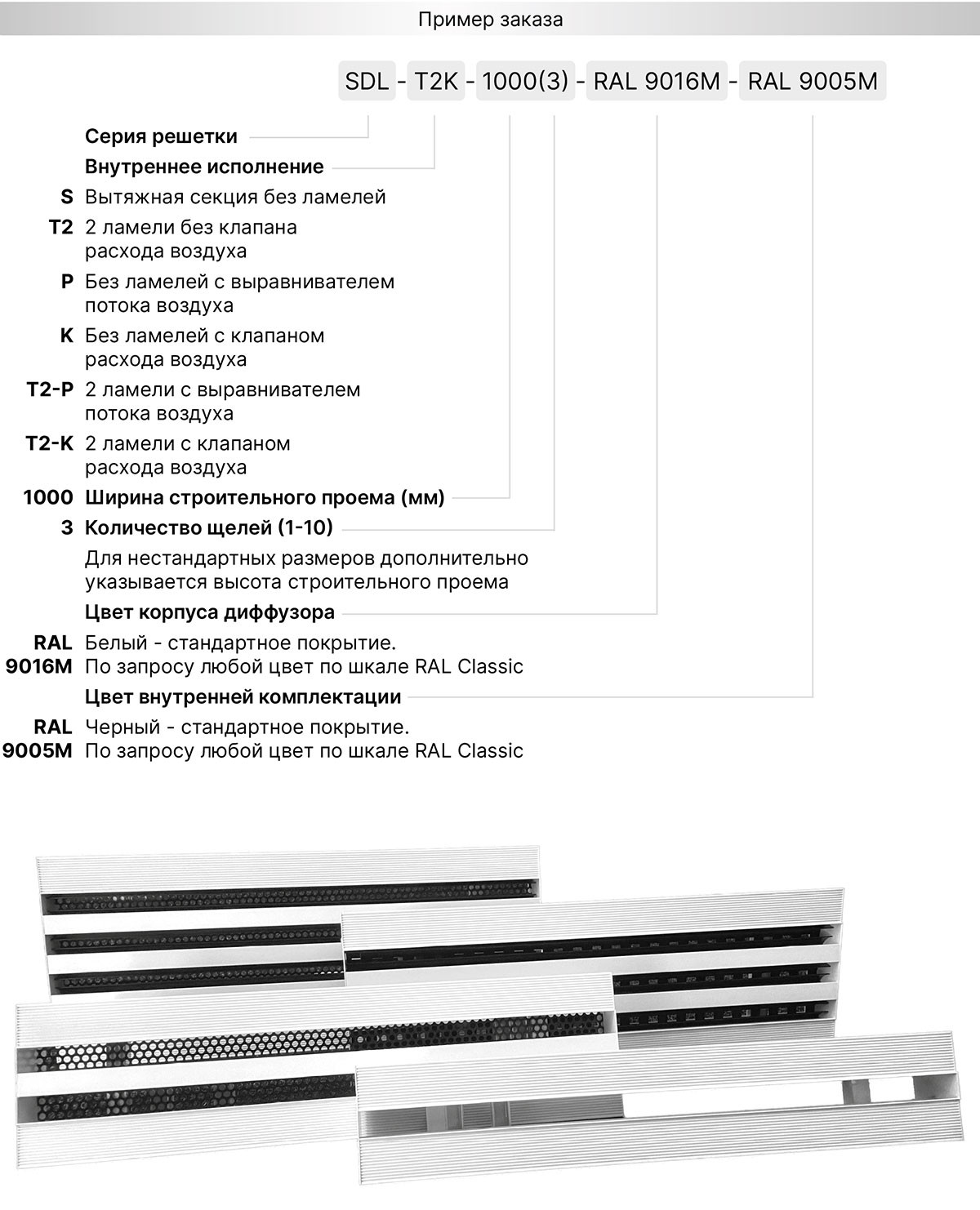 Щелевые решетки SDL изготавливаются из экструдированного алюминиевого профиля АД31 по ГОСТ 22233-2018. По умолчанию корпус решетки окрашивается в стандартный белый цвет RAL 9016М матовый, а внутреннее исполнение в чёрный цвет RAL9005М матовый. По индивидуальному заказу возможна окраска в любой цвет по шкале RAL. Статическая камера изготавливается из оцинкованной листовой стали 0,4 - 1,5 мм в зависимости от размера и пожелания заказчика. По умолчанию КСД поставляется в неокрашенном виде.